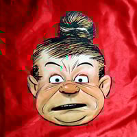 This vintage paper mask features Aunt Mamie, the tough, sharp-tongued boarding house owner from the long-running Moon Mullins comic strip. Known for her stern demeanor, larger-than-life expressions, and no-nonsense presence, Mamie was a comic foil to Moon and his rowdy companions throughout the strip’s decades-long run.