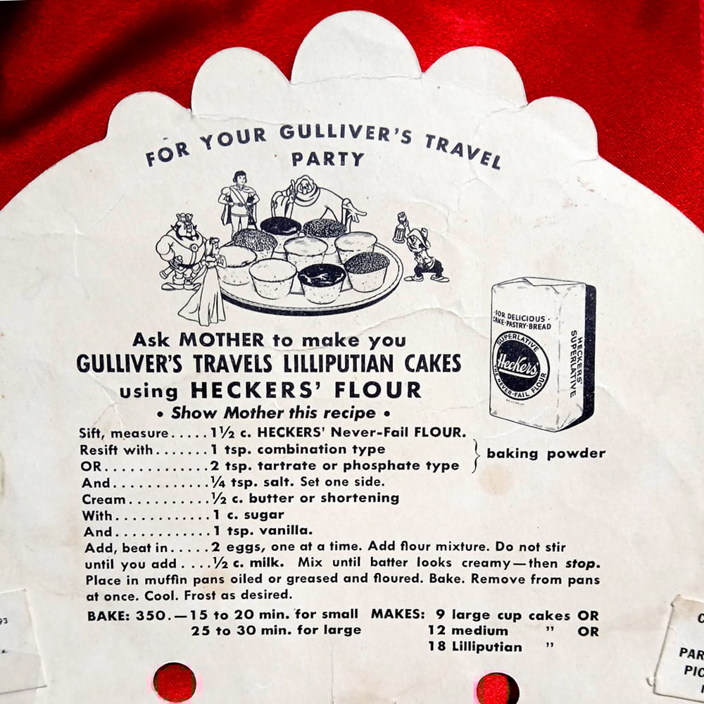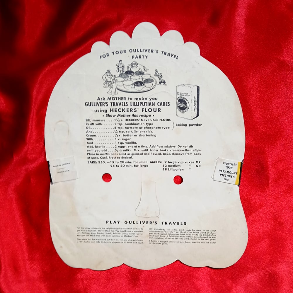 The back side includes a period-perfect “Lilliputian Cakes” recipe, along with directions for children to reenact scenes from the movie at home. Issued as a grocery-store tie-in, these masks were usually worn, bent, and discarded.