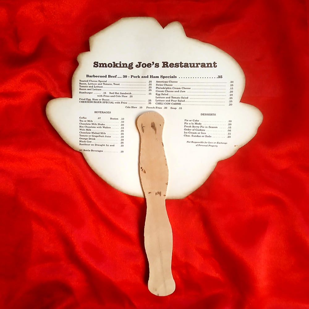 A deeply reflective piece of mid-century American advertising ephemera — a double-sided restaurant menu fan from Smokin’ Joe’s Restaurant, printed on die-cut card stock with a racially caricatured “porter” face illustration on the front, mounted to a flat wooden handle. The reverse features the full printed menu, including “Barbecued Beef 30¢,” “Ham and Pork Specials,” and beverages from 5¢ to 10¢
